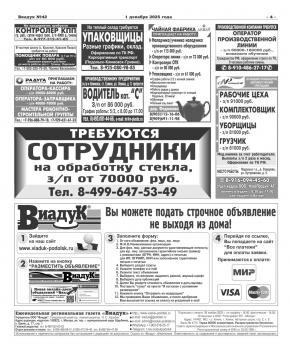 ВНИМАНИЕ! Уважаемые читатели и рекламодатели газеты “Виадук”, доводим до Вашего сведения, что ПО ПЯТНИЦАМ строчные объявления в текущий номер принимаются до 15.00. С 15.00 только в рубрику "Срочно в номер" с наценкой 100% при наличии свободной площади в газете.