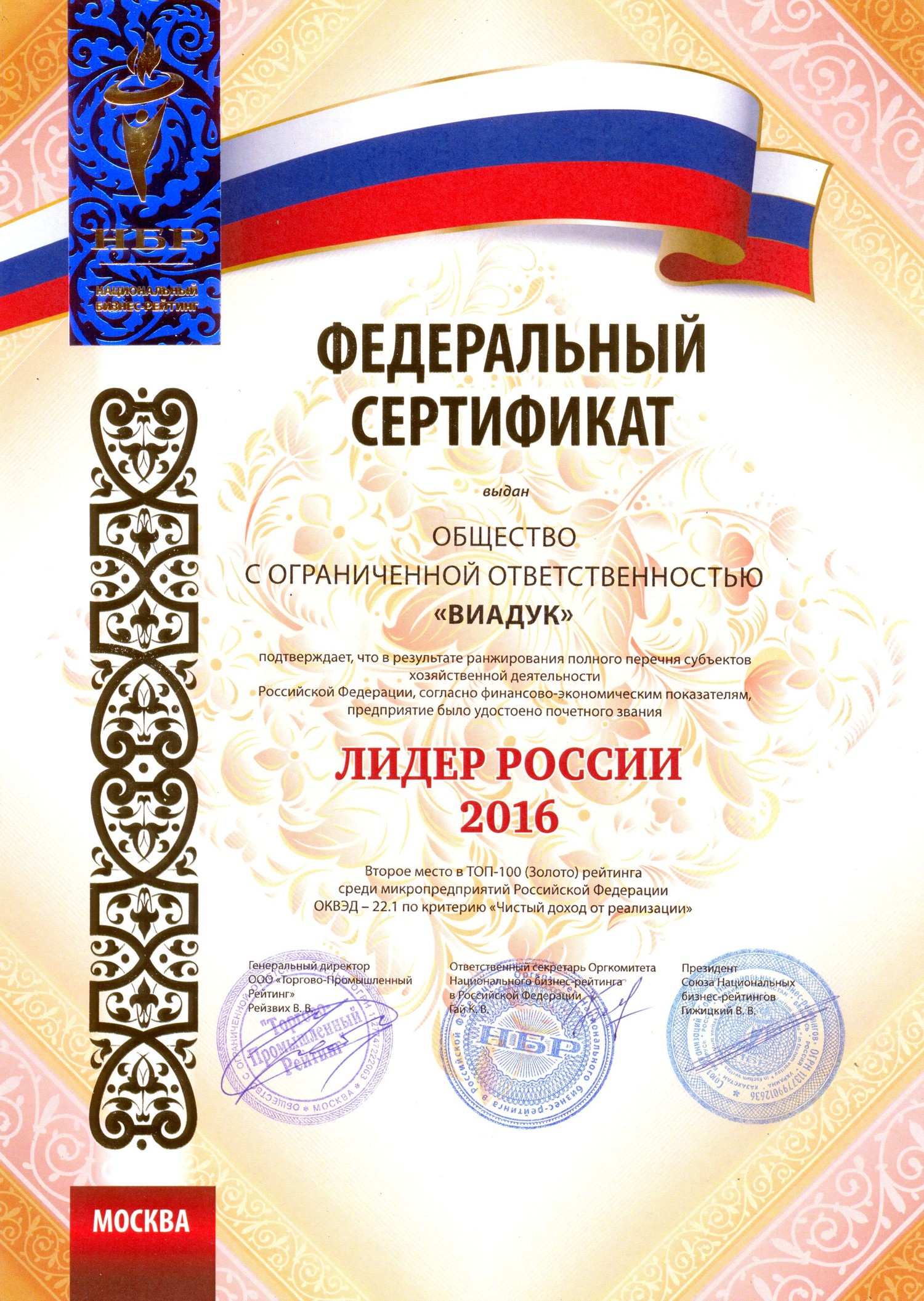 Федеральный сертификат «ЛИДЕР РОССИИ 2016»