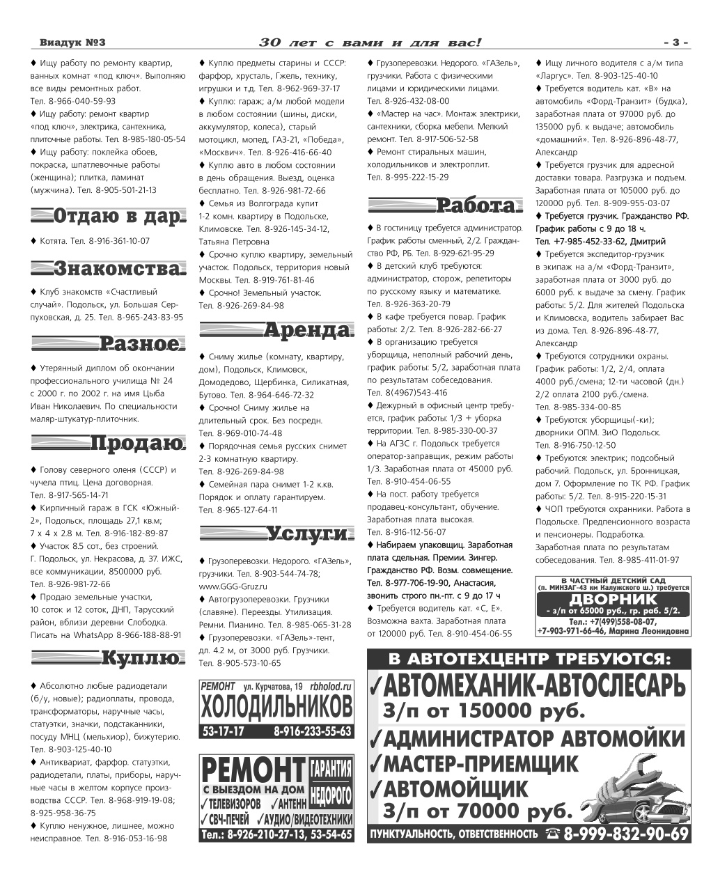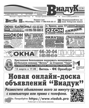ВНИМАНИЕ! Уважаемые читатели и рекламодатели газеты “Виадук”, доводим до Вашего сведения, что ПО ПЯТНИЦАМ строчные объявления в текущий номер принимаются до 15.00. С 15.00 только в рубрику "Срочно в номер" с наценкой 100% при наличии свободной площади в газете.